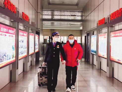 周口東站客運值班員在站臺幫扶重點旅客前往候車位置。王瑋 攝