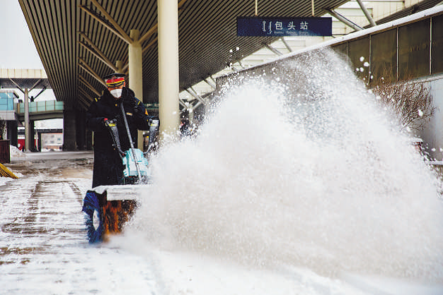 包頭地區(qū)普降中雪,包頭站客運員利用除雪機清掃站臺積雪,防止旅客滑倒摔傷。李振鵬 攝