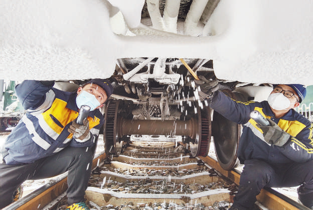 包頭車輛段職工正在清理列車走行部積雪,檢查制動系統(tǒng)狀態(tài)。常文斌 攝