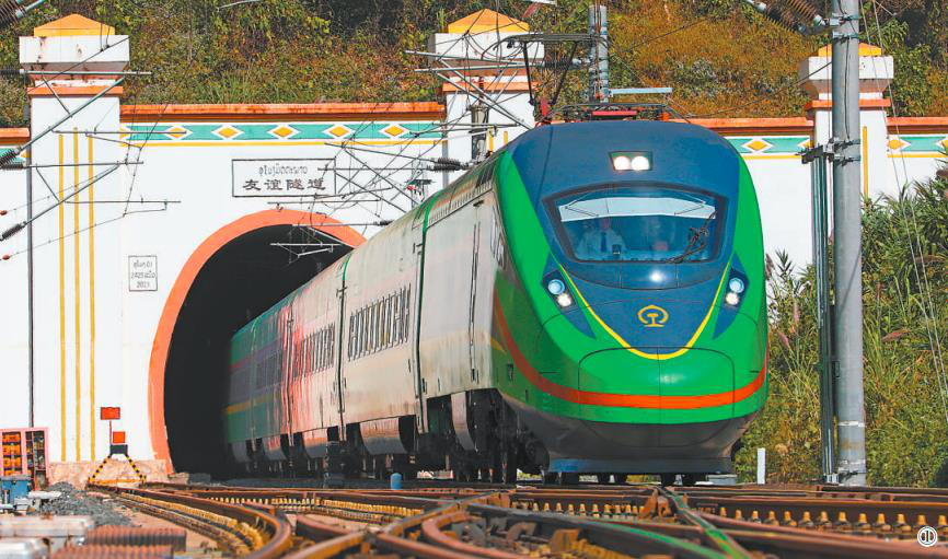 4月13日,中國西雙版納至老撾瑯勃拉邦的中老鐵路國際旅客列車駛出中老兩國邊界的友誼隧道。