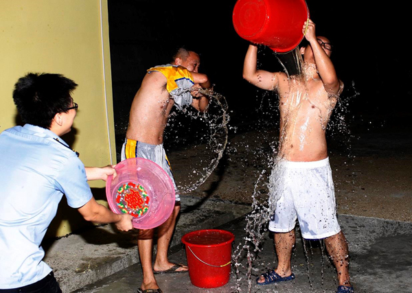 生活用水,終于從相鄰的車站引了過來,大家開心的沖個涼。