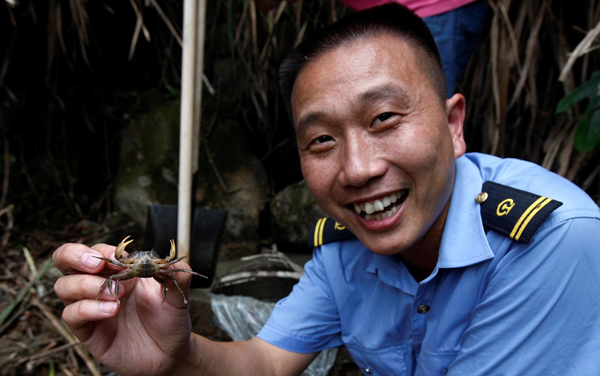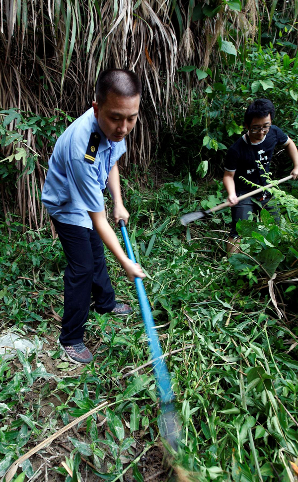 大伙從老鄉(xiāng)家借來兩把柴刀,在兩米多高的雜草叢中搜索水源。