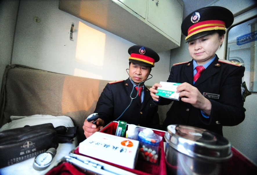 在齊齊哈站出乘前,列車長與紅十字救護員對列車應急小藥箱內的藥品和醫療器械認真檢查,確保萬無一失。