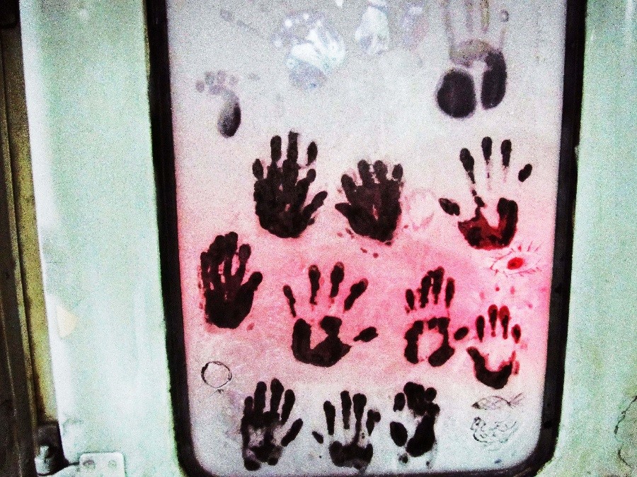 車廂連接處門頭的車窗玻璃上凝結了一層厚厚的冰霜。幾名旅客在上面印上了手掌印,頗有幾分冬趣。