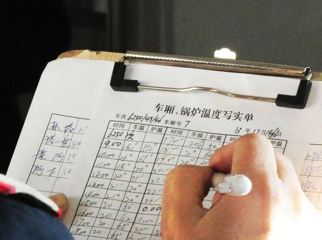 為了保證車內溫度達標,列車員每小時都要進行一次寫實,把車廂溫度、鍋爐溫度記錄寫實單上。