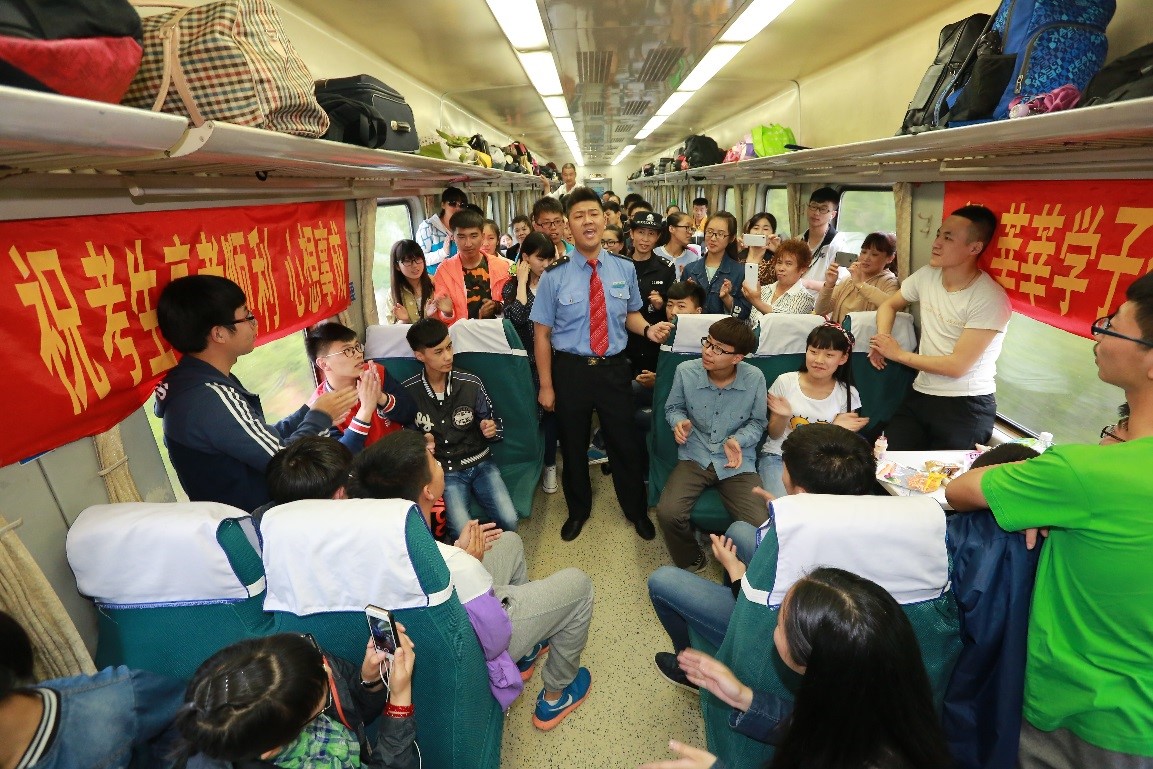據(jù)悉,高考專列已開行13年,運(yùn)送考生2萬余名,幫助5700多名學(xué)子實(shí)現(xiàn)了大學(xué)夢(mèng)。圖為列車工作人員為考生們表演節(jié)目。