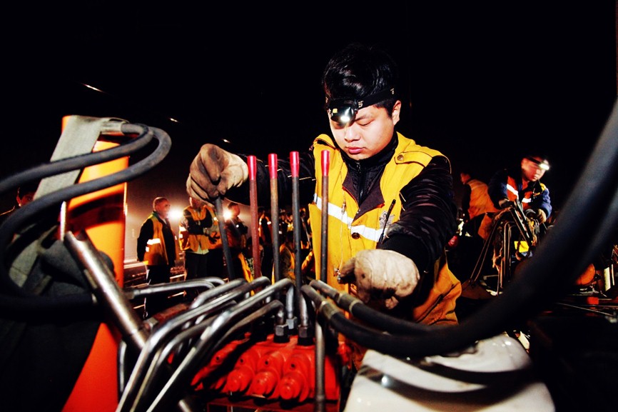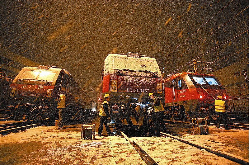 西安鐵路局西安機務段專檢專修組職工迎風冒雪精檢細修機車,為春運提供充足的動力保障。 劉翔 攝