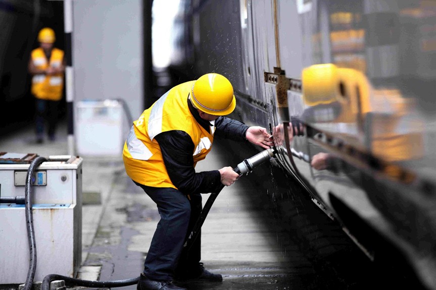 成都東站上水工為“和諧號”動車組上水。胡志強 攝