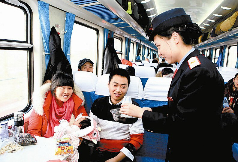 K668次列車員熱情地幫帶孩子回鄉的旅客熱奶。高錦旭 攝