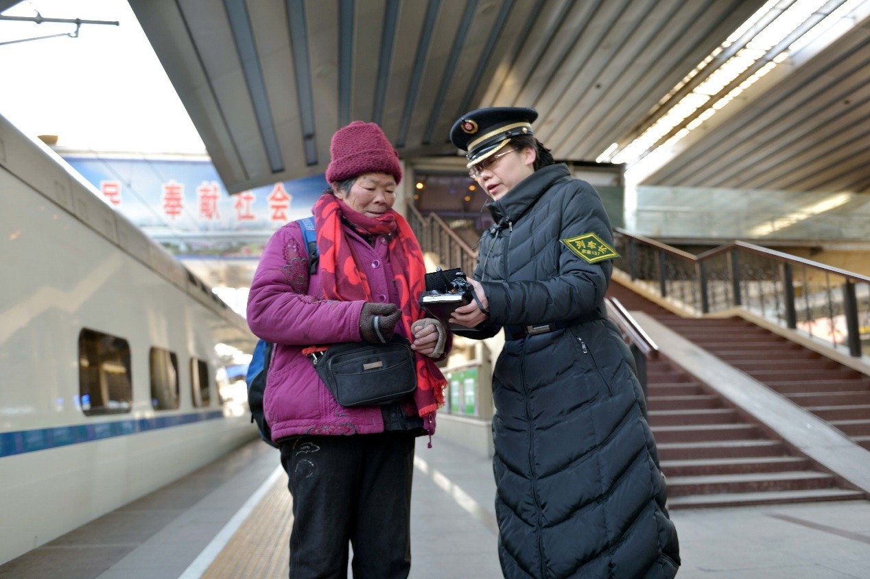 D25次列車長在站臺為旅客解答問詢。王博軒 攝