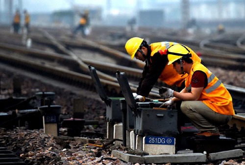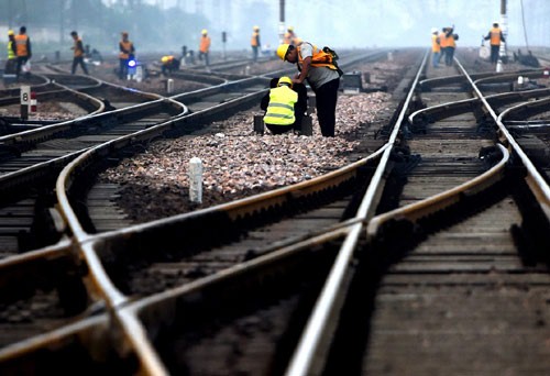 施工人員在交錯的鐵軌間更換信號設備。