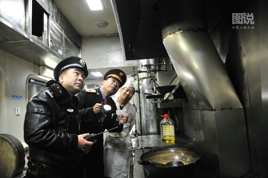 賈志杰與列車長對餐車廚房的設備運行情況進行巡查、登記。