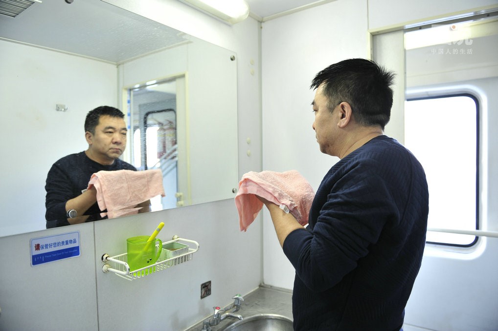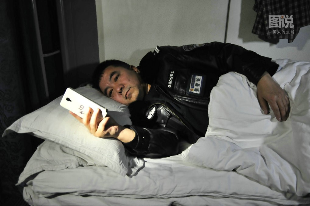 賈志杰在結束一晚的夜間執勤后洗漱準備休息。