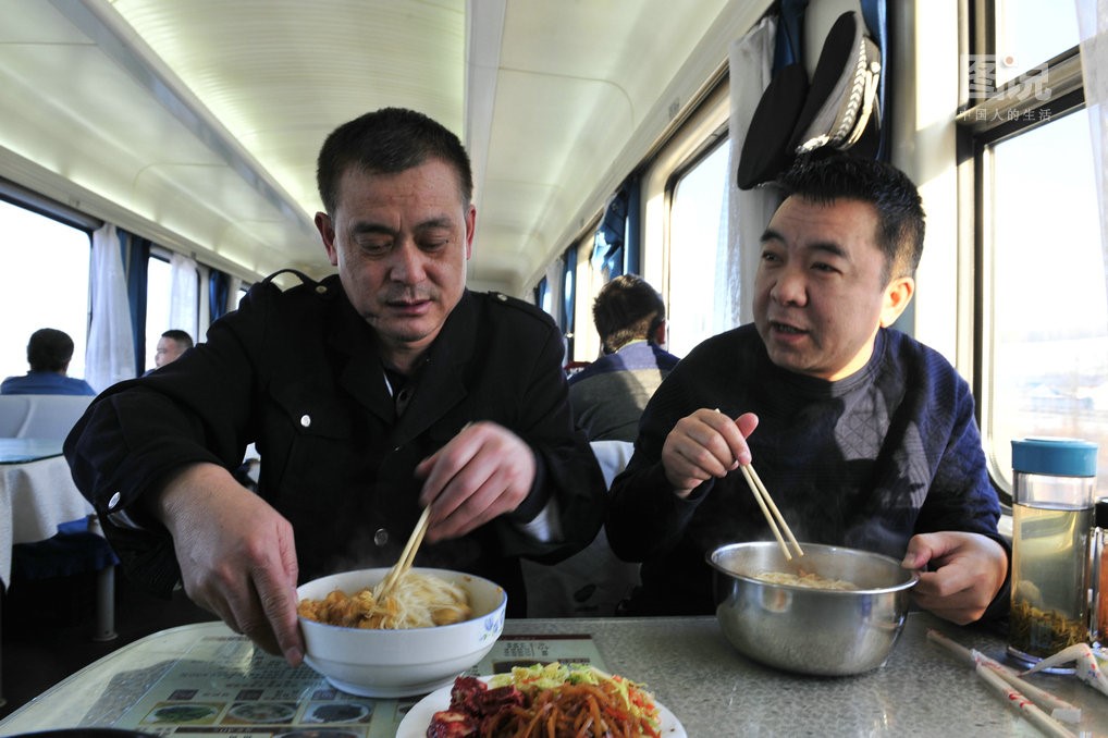 賈志杰(右)結束執勤后與列車上的同事一起吃早飯。