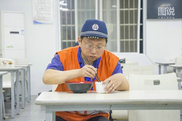 由于動車組都是陸續入庫,等待下一次清污任務間隙,冷玉明到職工食堂吃夜宵補充體力。有的時候,動車組要凌晨3點才能入檢修庫,冷玉明就必須等到3點鐘把吸污任務完成。