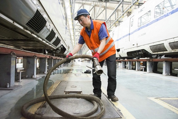 冷玉明在按照作業規定,確認動車組吸污作業條件。“列車上傳統的直排式廁所早就過時了,現在采用的都是類似飛機上的真空集便器廁所。”冷玉明介紹,真空集便器是將糞便集中排到污物箱中,當高鐵列車到達動車所后,再由專業的吸污工人對污物進行轉移,利用真空負壓將污水污物吸入地下,通過地下管道匯入化糞池。
