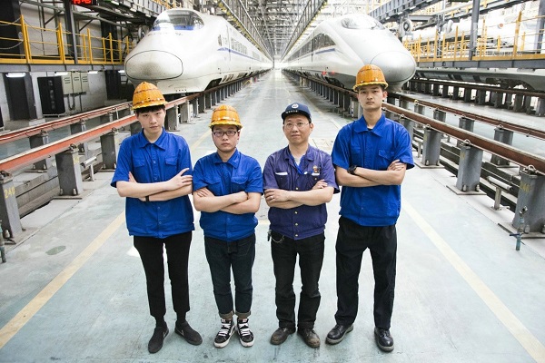 4月30日早晨,冷玉明(右二)和值班工友同清污后的動車組合影。冷玉明所在的吸污組共有14人,其中1名工長,3人負責白班,10人負責晚班。晚班分為兩個組,倒班作業,冷玉明是晚班組的一員。在吸污組,冷玉明是年紀最大的員工之一,組內90后的同事私下開玩笑喊他“掏糞老男孩”。