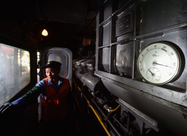 滿頭是汗的專檢工長孔祥福在檢修火車儀表。