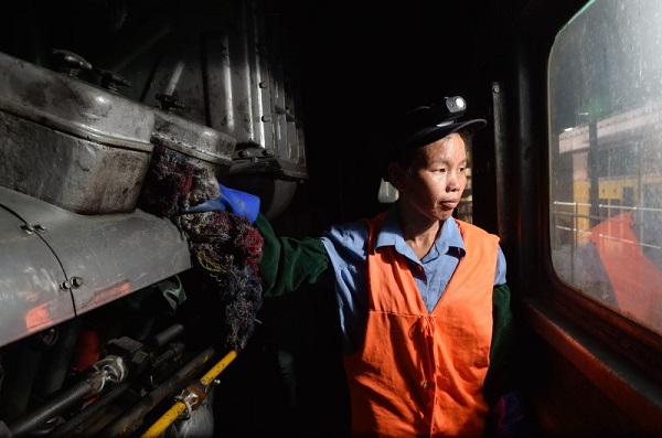保潔工人馮新娣在一列內燃機車的機械間擦洗設備。為了防止被機器燙傷,她和工友們都會穿著長衣長褲、戴著膠皮手套作業。