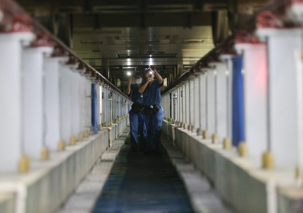 技術人員黃思遠(右)與陳志春在對“復興號”動車組列車進行車底檢查。