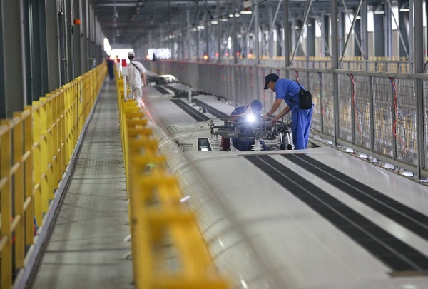 技術人員在對“復興號”動車組列車進行車身檢查。