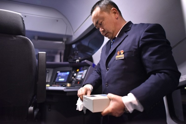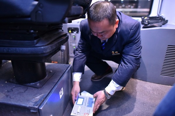 陳輝在DJ8841次動車組駕駛艙內安裝便攜式線路檢查儀。