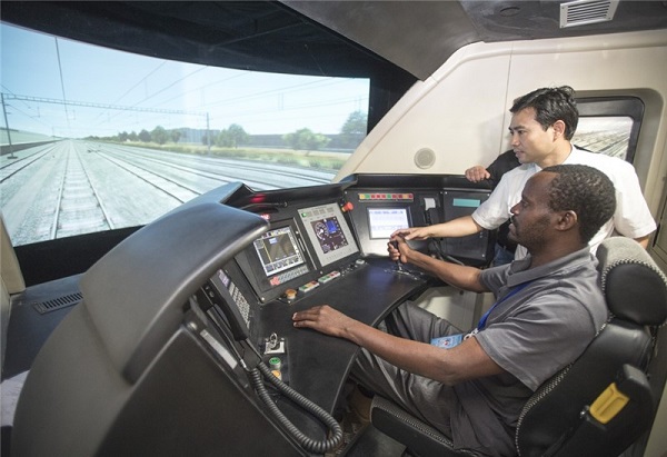 來自肯尼亞的賈斯特斯?卡洛?姆文加在高鐵模擬駕駛倉內體驗實際操作。