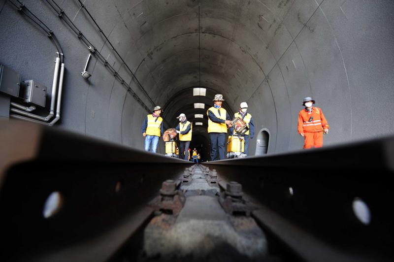 養(yǎng)護(hù)工人在新關(guān)角隧道內(nèi)利用探傷儀檢查鐵軌。