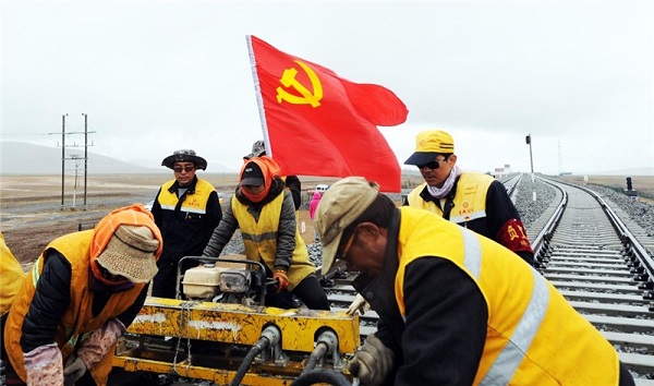 青藏集團公司格爾木工務段唐古拉線路車間支部黨員在青藏鐵路唐古拉站附近進行養護作業。