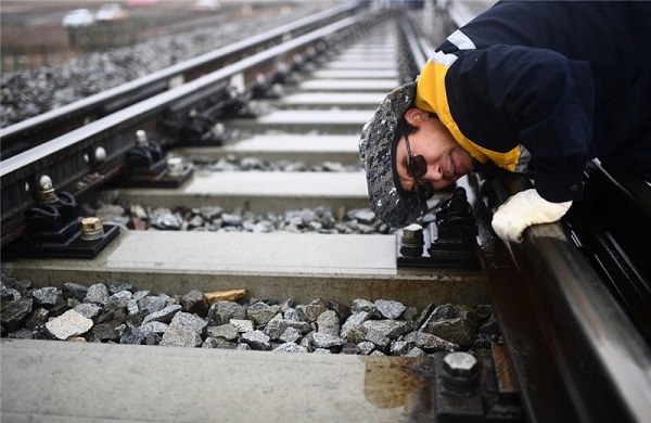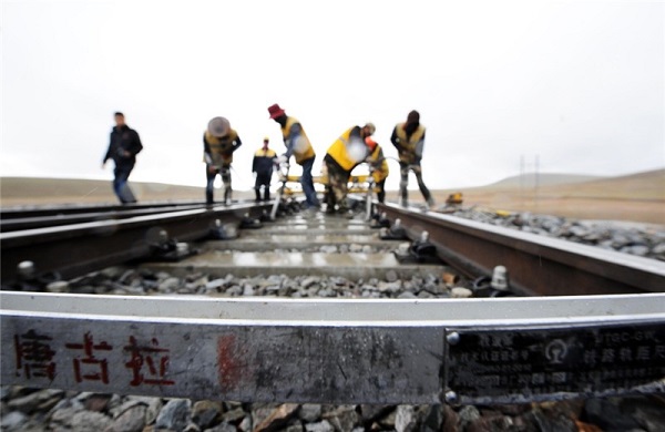 青藏集團公司格爾木工務段唐古拉線路車間主任李彪林檢查路軌維護狀況。