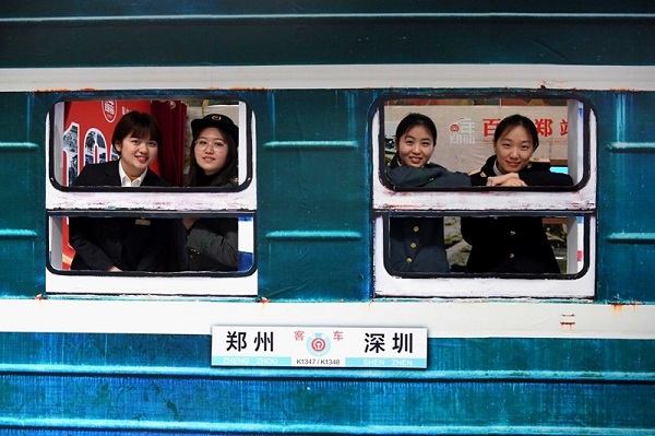 鄭州火車站在站內開設“百年鄭站時光機”,體驗者穿著不同時期的鐵路職工工作服在“綠皮車”造型展板前留影。(來源:新華社)
