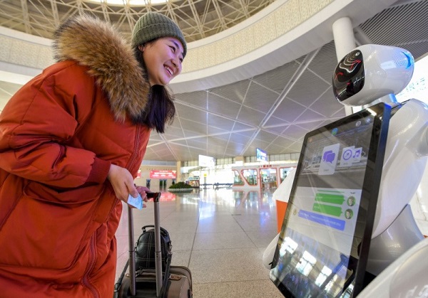 旅客在呼和浩特火車東站與智能機器人交流。(來源:新華社)