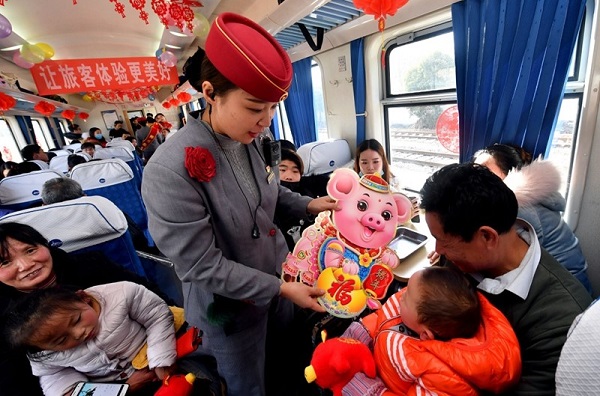 在貴陽北開往寧波的G2334列車上,乘務員為旅客送上春聯、福字掛歷和生肖豬玩偶等新年禮品。(來源:新華社)