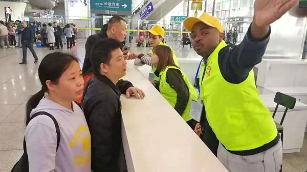 外籍青年志愿者在廣州南站服務旅客。(來源:人民鐵道網)