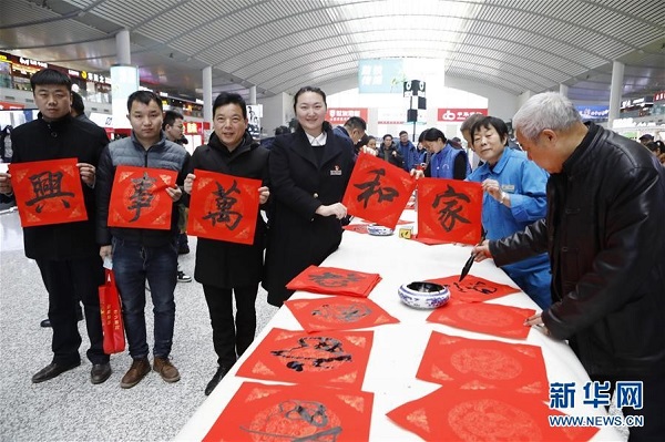山東濟南西站職工和旅客手舉“家和萬事興”的書法作品合影留念。(來源:新華社)