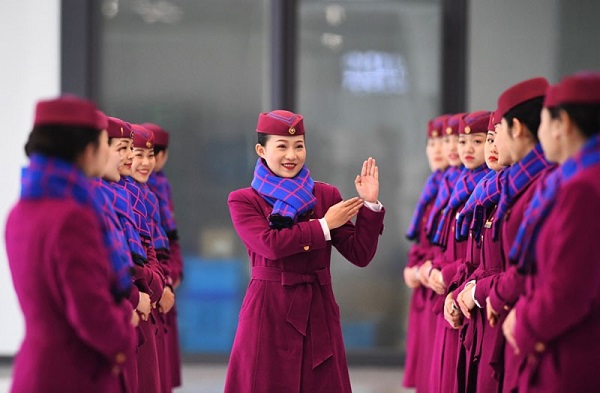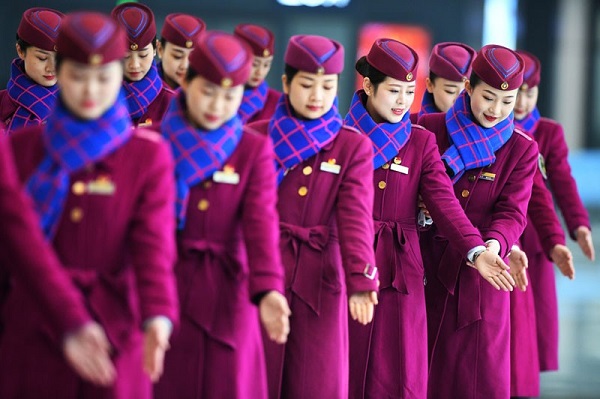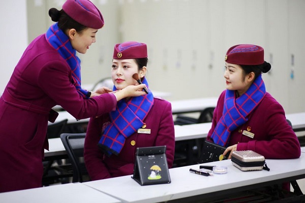 1月8日,乘務人員在進行妝容禮儀培訓。