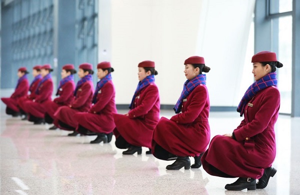 1月8日,乘務人員在進行蹲姿禮儀培訓。