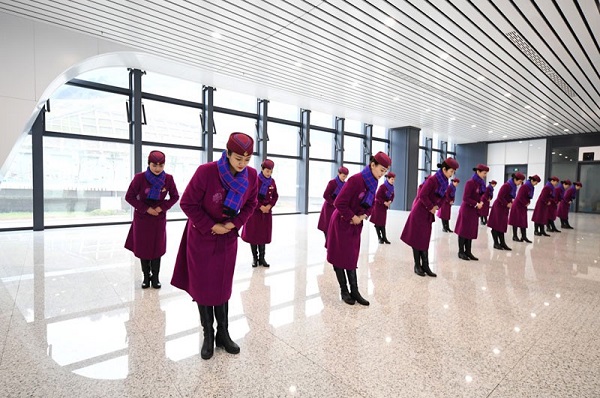 1月8日,乘務人員在進行指引手勢禮儀培訓。