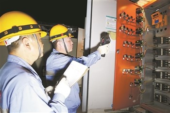 職工利用紅外熱成像測試儀對變壓器、開關等重點處所進行溫度測量。
