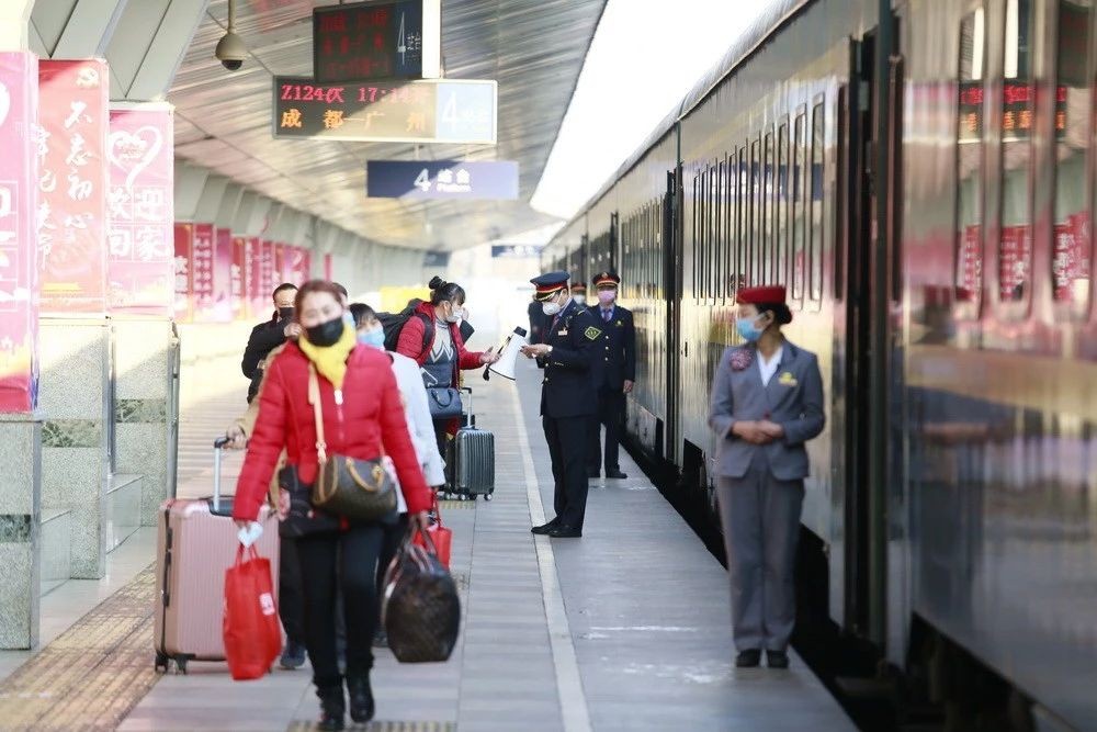 1月29日,成都客運段Z124次列車乘務員正在引導旅客乘車。中國鐵路成都局集團公司 李鍇 攝