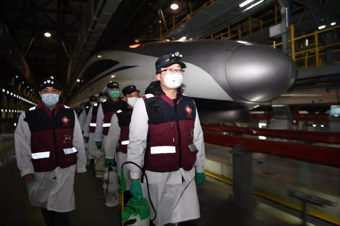 1月29日,鐵路疾控人員在鄭州動車段對入庫檢修的動車組進行全面消毒處理。中國鐵路鄭州局集團公司 趙慶攝