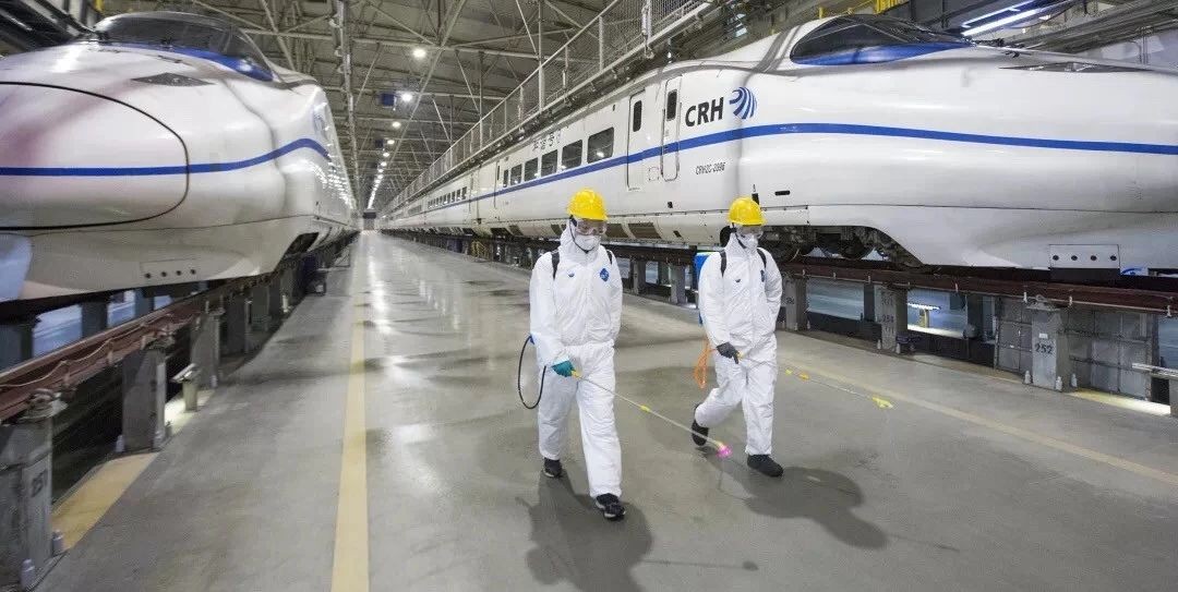 2月3日,西安動車段工作人員對動車組檢修區域進行消毒。中國鐵路西安局集團公司 王曙天 攝