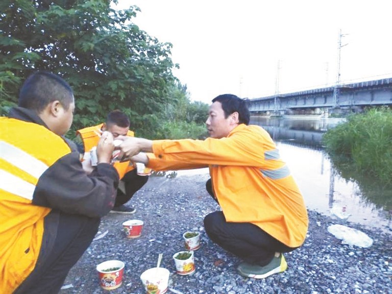 圖為辛安渡橋橋梁看守人員在看守點吃簡餐補充體力。