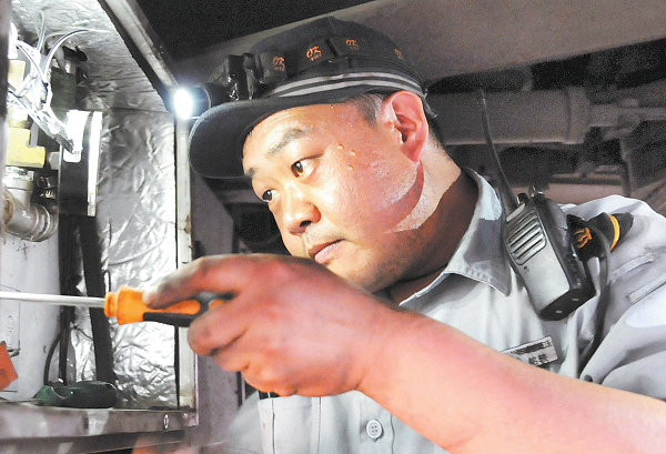 由于集便器電路系統(tǒng)位于車體下部,檢修過程中,蔣明軼經(jīng)常是頭緊緊地貼在斜上60度的左臂上,使出全力才能擰動蝶閥。有時污水突然噴出,濺得滿身滿臉都是,但他早已見怪不怪了。