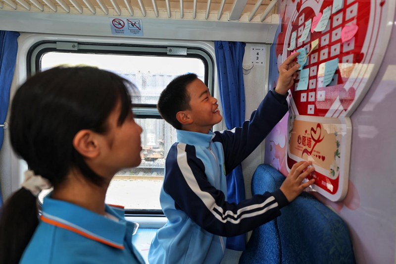列車緩緩前行,陽光斜灑進車廂,小小的心愿墻上,密密麻麻的便簽隨著列車的行進輕輕晃動。乘車的孩子們紛紛寫下自己的閱讀計劃和推薦書籍,每一張便簽都承載著他們對知識的渴望與熱愛。
