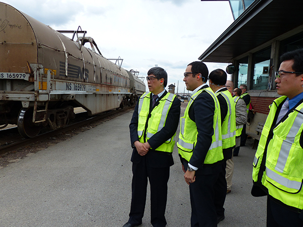 圖為陸東福局長(左一)在美國聯合太平洋鐵路公司芝加哥貨場了解貨運組織情況