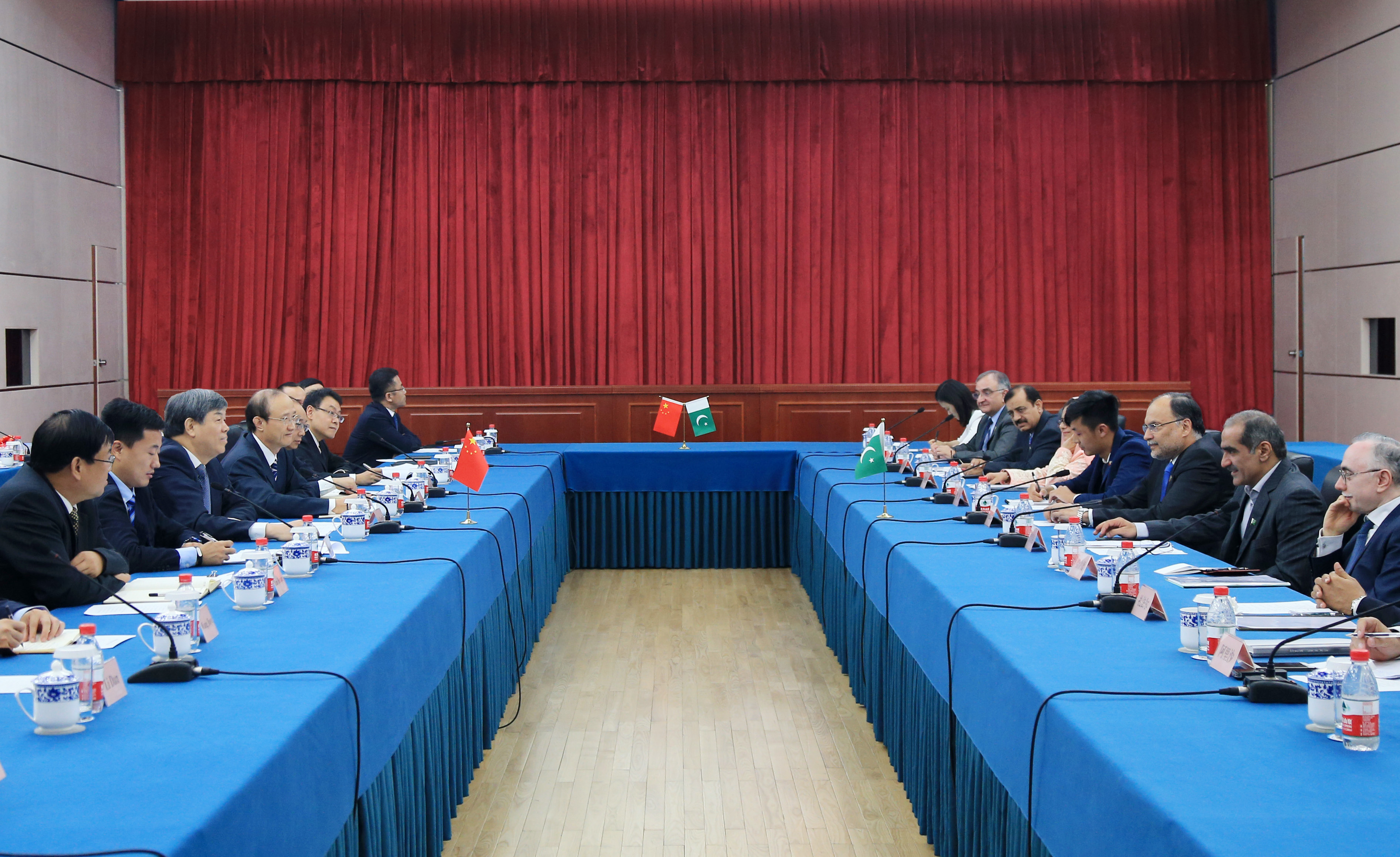 陸東福(左三)與巴基斯坦計劃發展部長伊克巴爾(右三)、鐵道部長拉菲克(右二)共同主持召開中巴鐵路合作部長級會議