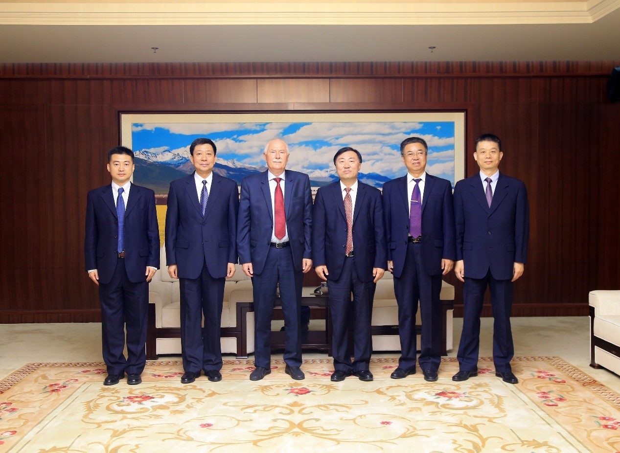 交通運輸部副部長、國家鐵路局局長楊宇棟(右三)會見鐵路合作組織委員會主席紹茲達(左三),國家鐵路局副局長于春孝(右二)、劉克強(左二)參加會見。