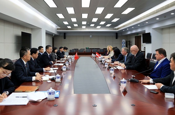 10月23日,國家鐵路局副局長于春孝(左四)在北京與來訪的奧地利聯邦鐵路公司總裁馬特(右三)及奧地利駐華大使石迪福(右四)一行舉行會談。雙方就深化中奧鐵路政府間合作交流,加強對話合作機制建設、共同推進絲綢之路經濟帶建設等雙方共同關心的問題廣泛交換了意見。