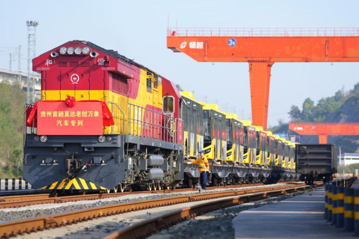10月底,55臺“貴州造”新能源客車搭乘西部陸海新通道國際鐵路聯運班列,從貴陽國際陸港都拉營站開出,不久后抵達老撾萬象。